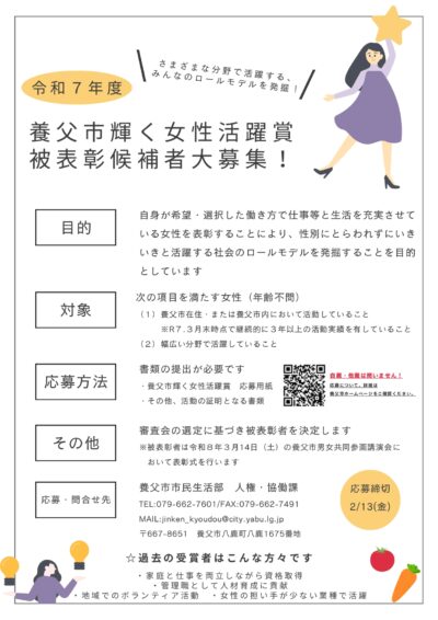 自らの希望や選択に基づき、仕事と生活の両立を図りながら、地域や職場で活躍している女性を表彰する 「令和7年度養父市輝く女性活躍賞」 の候補者を募集しています。