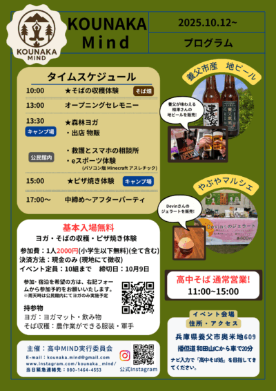 10月12日(日)、深い森と澄んだ空気に包まれた山の集落「高中」で、地元の人々とともに季節を味わうイベント「KOUNAKA Mind」を開催します。そばの収穫体験、森林ヨガ、地元食材の窯ピザづくりなど、五感で楽しむプログラムをご用意。キャンプや車中泊も可能です。