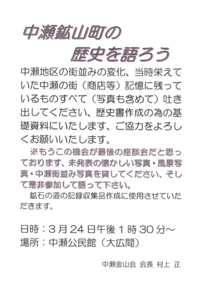 ※もうこの機会が最後の座談会だと思っております。未発表の懐かしい写真・風景写真・中瀬街並み写真を貸してください。そして是非参加して語ってください。鉱石の道の記録収集品作成に使用させていただきます。