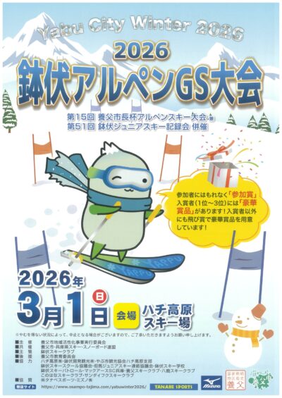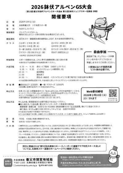 養父市長杯と鉢伏ジュニアスキー記録会とを同日開催します。競技種目はジャイアントスラローム。