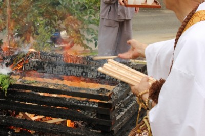 柴燈護摩(さいとうごま)壇に火を点じ、その煙にあたることで福をいただき幸せになれるといわれています。