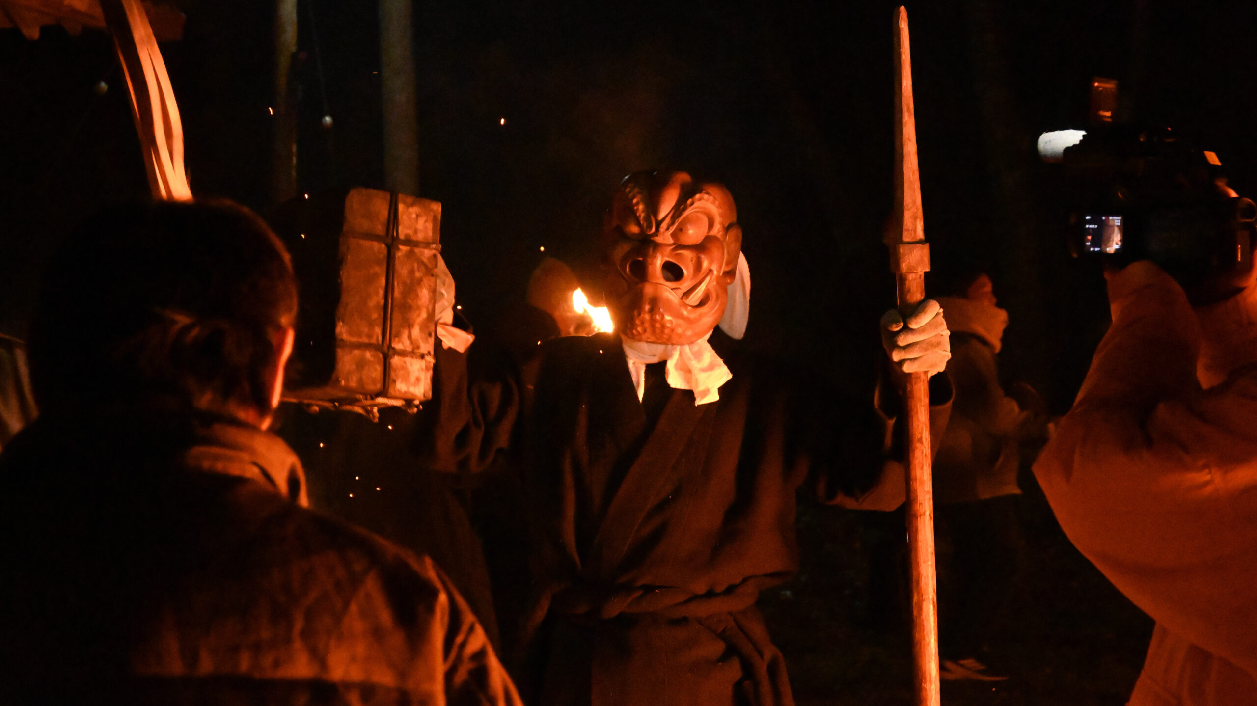 燃えさかる松明の炎で古鬼面(こきめん)姿に木鉾(きぼこ)を持った鬼をたたき、その年の無病息災を願います。