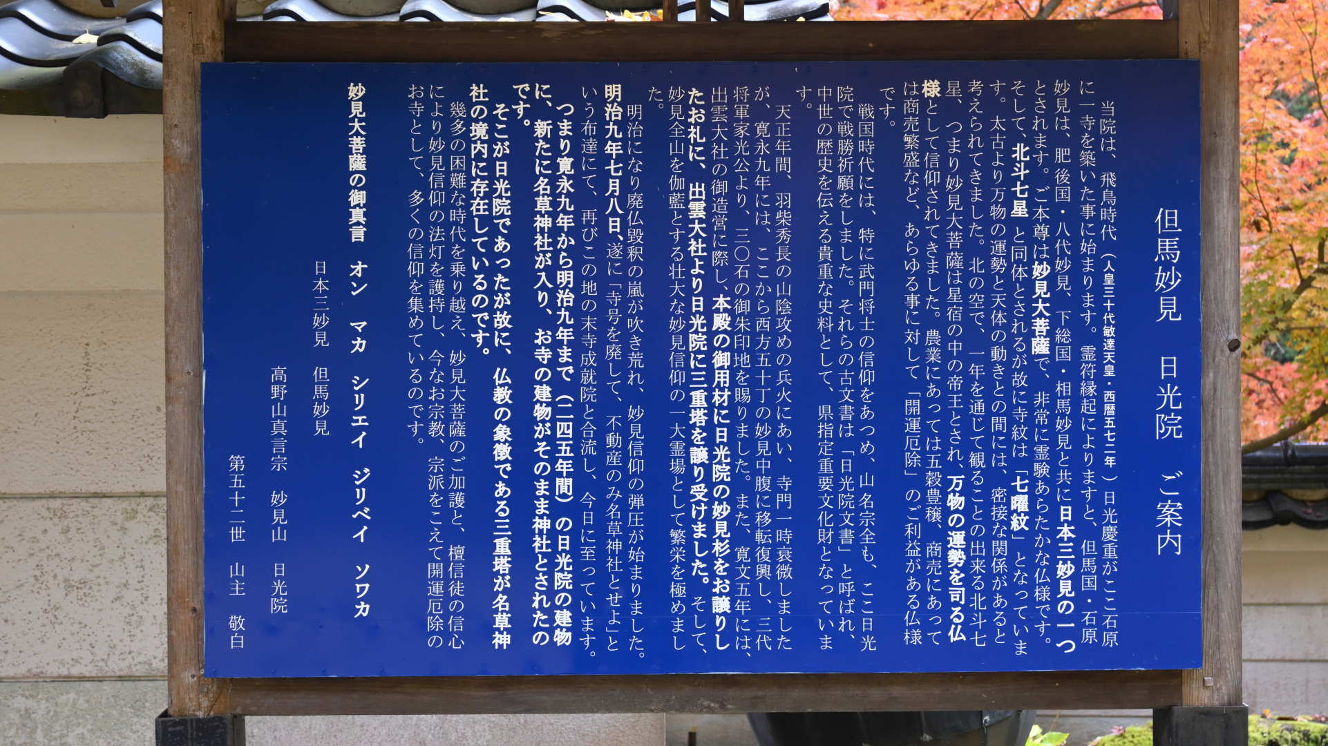 詳細を見る日光慶重(にっこうけいちょう)が開いたと伝えられる真言宗の古刹(こさつ:由緒ある古いお寺)。近世まで帝釈寺日光院(たいしゃくじにっこういん)と称し、妙見大菩薩(みょうけんだいぼさつ)を本尊とする法統を今に伝えています。最近は但馬七福弁財天めぐり(招福弁財天)、近畿23ヵ所楽寿観音めぐりの霊場として知...